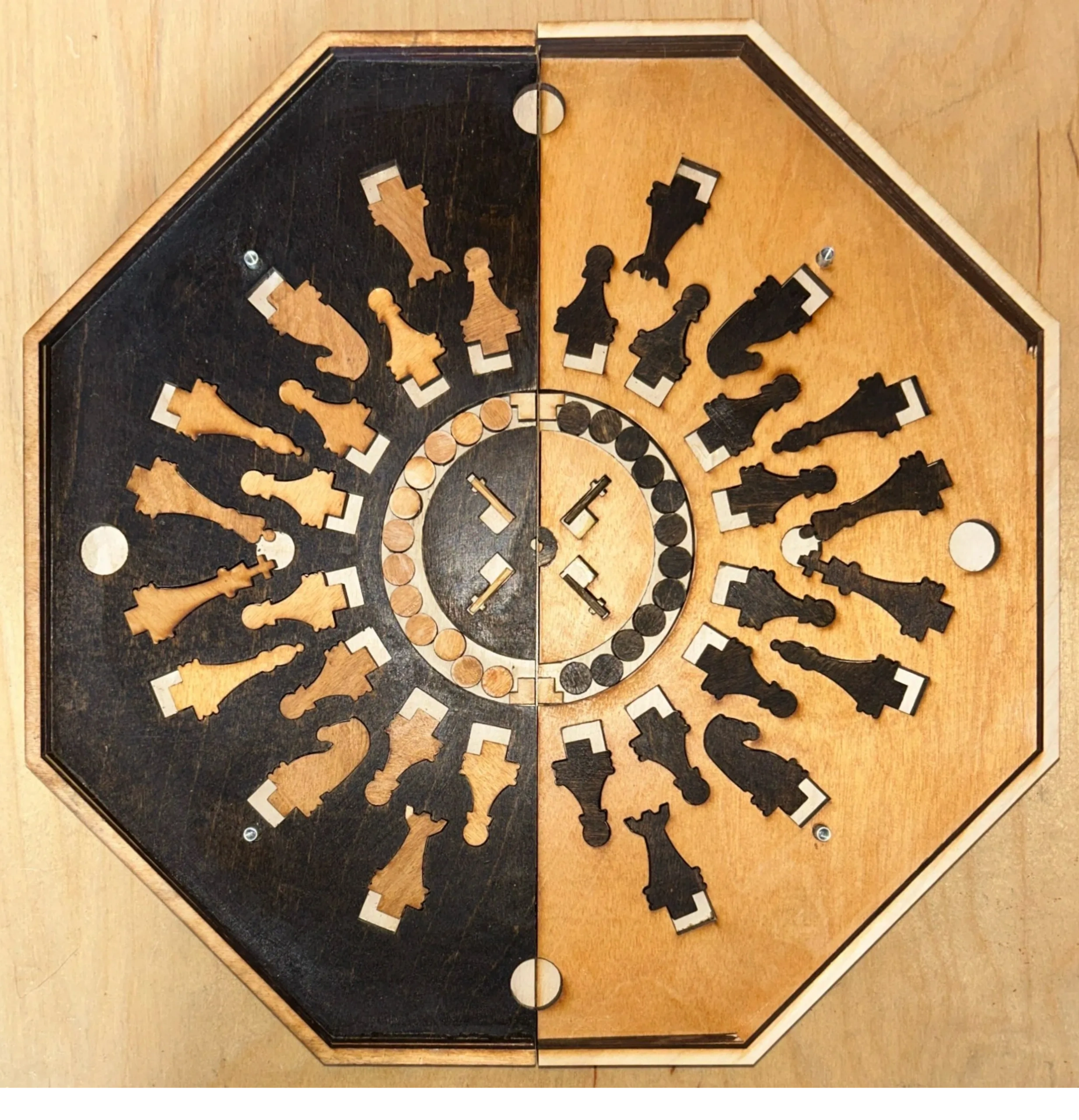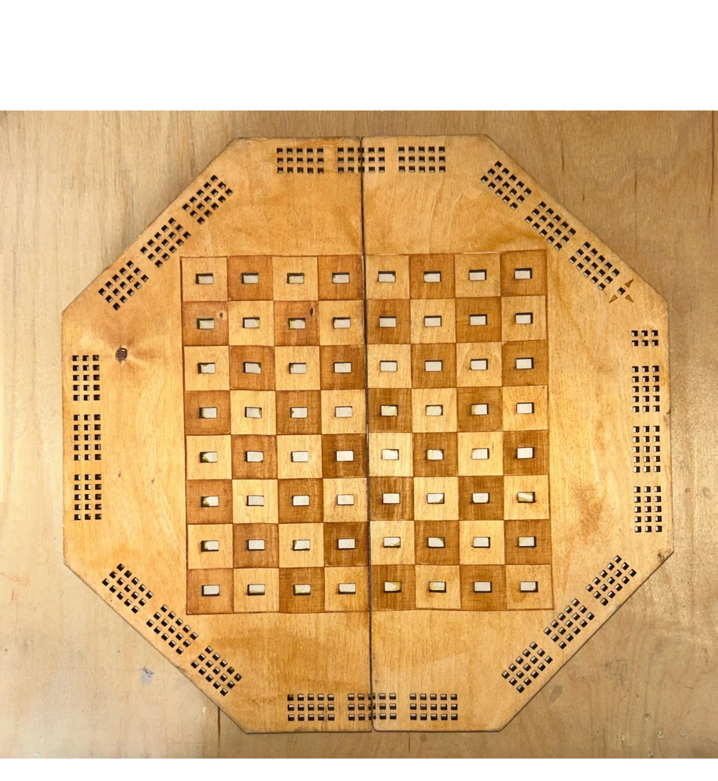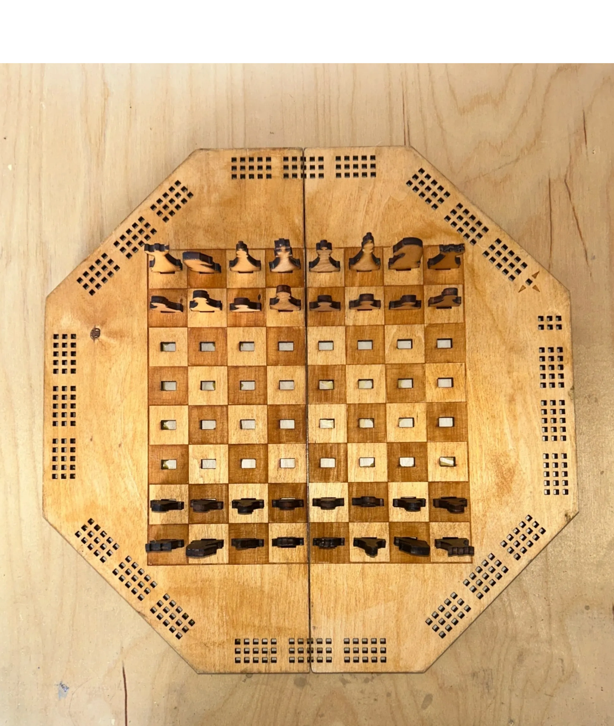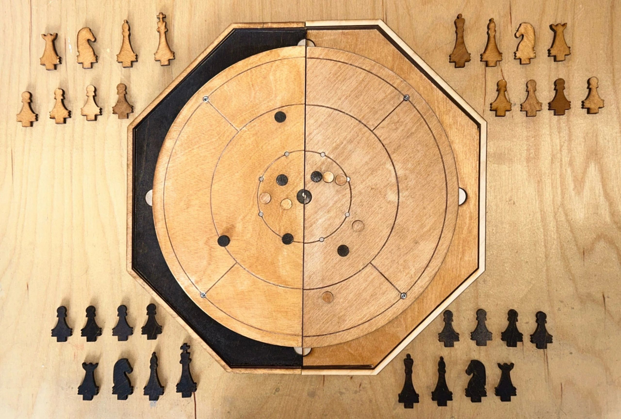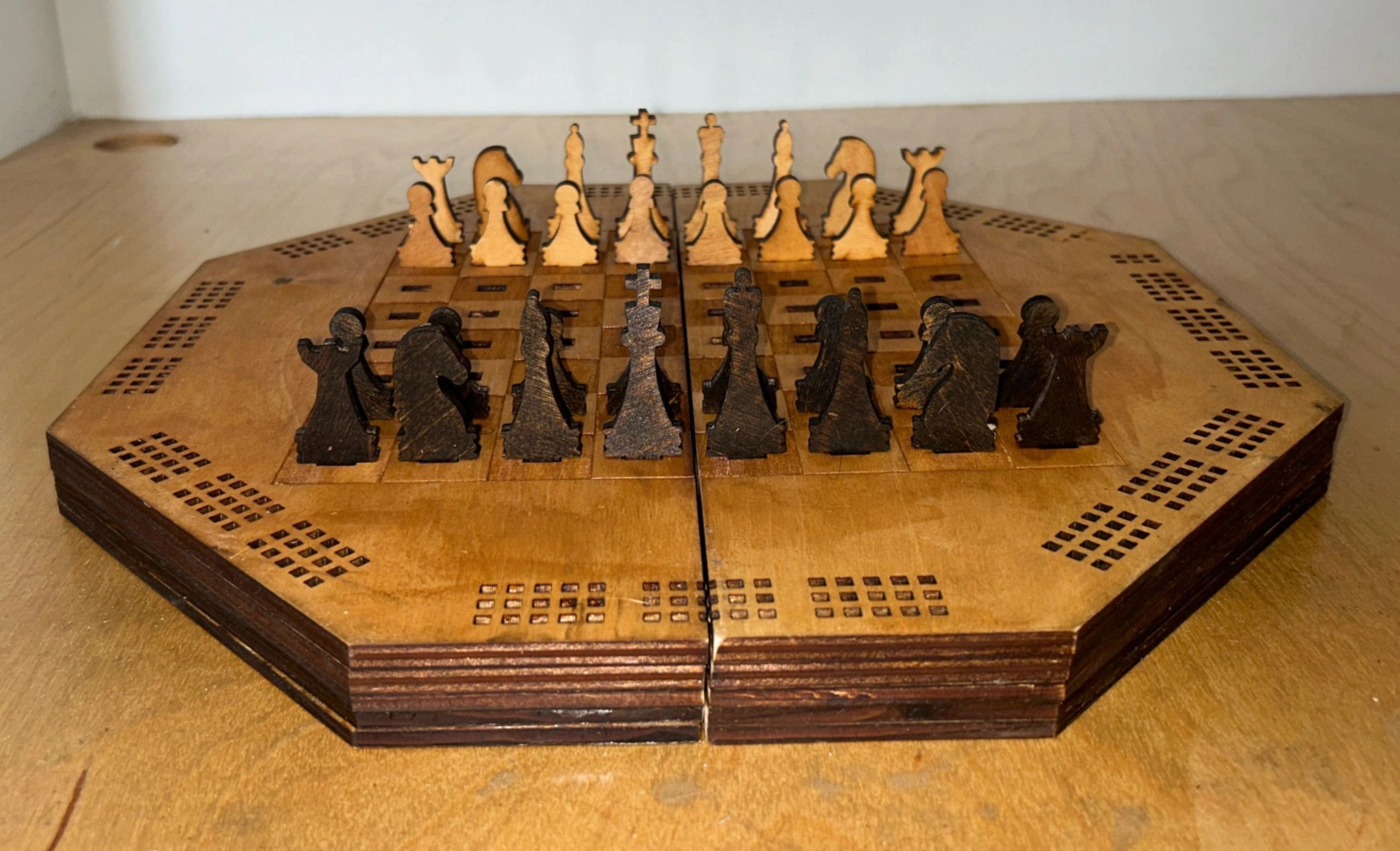 Below is the game board designed and laser cut to optimize space efficiency while containing as many games as possible. The chess, crokinole/checkers, and cribbage pieces are all inlaid into the board underneath the the crokinole board for storage, secured by screws.